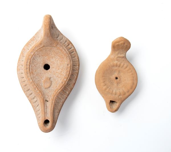 Lotto di 3 lucerne in terracotta con decori a rilievo di kiro e simboli paleocristiani
