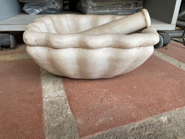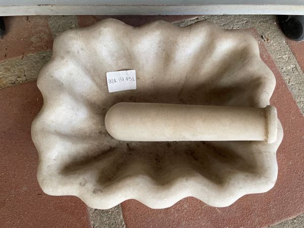 Mortaio in marmo statuario a bordo mosso a forma di conchiglia con pestello