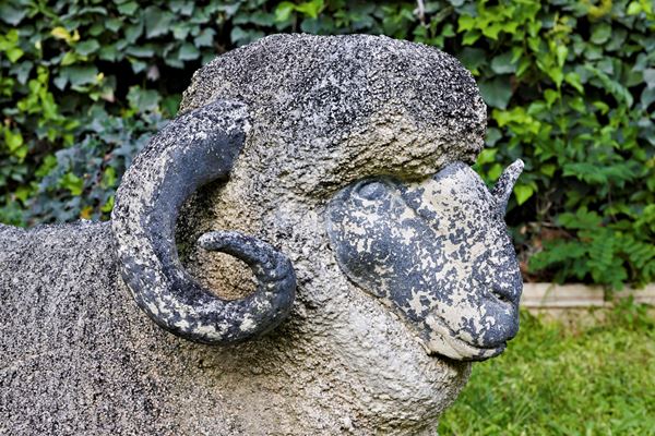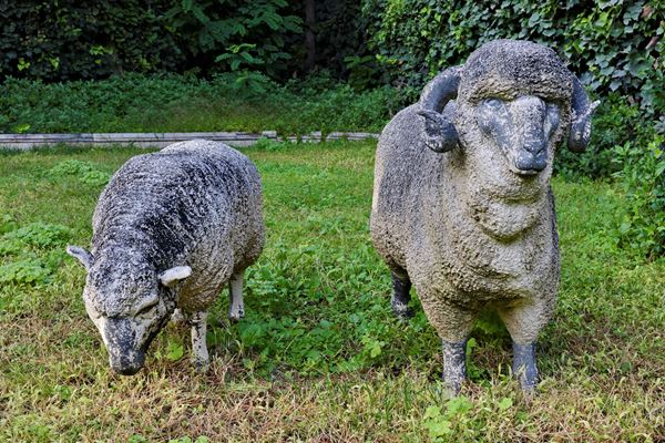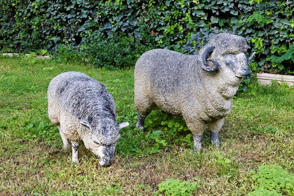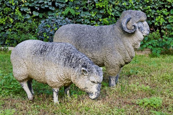 Sculture da esterno raffiguranti pecora e montone in cemento