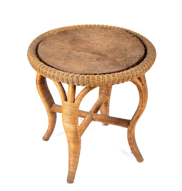 Tavolino in vimini con gambe arcate e piano riccamente intrecciato con cornice a torciglione