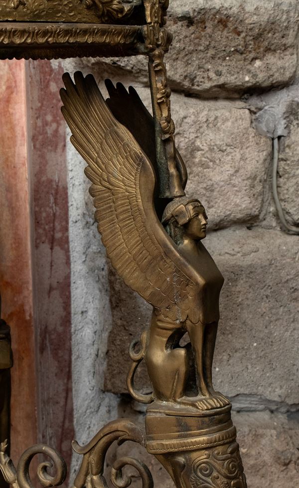 Tripode in bronzo dorato in stile impero con piedi ferini raccordati da candelabra centrale e 3 sfingi alate alle gambe. Stuttura circolare [..]