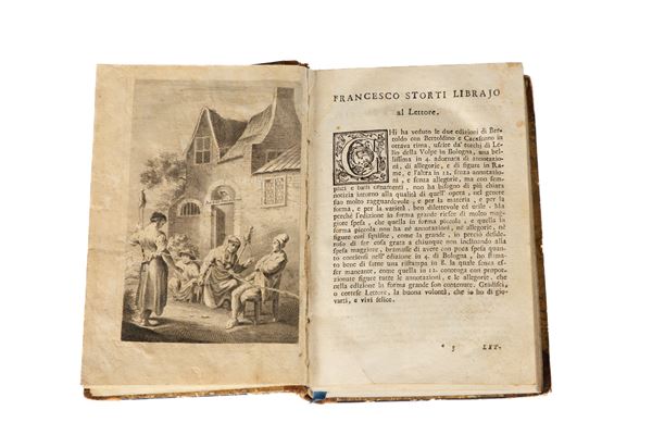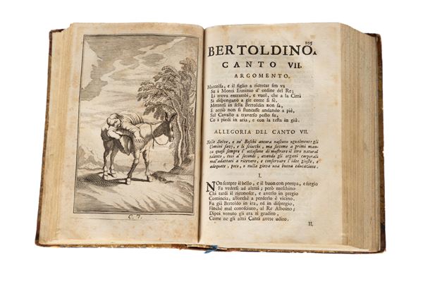 Bertoldo con Bertoldino e Cacasenno in ottava va rima con argomenti, allegorie, annotazioni e figure in rame.