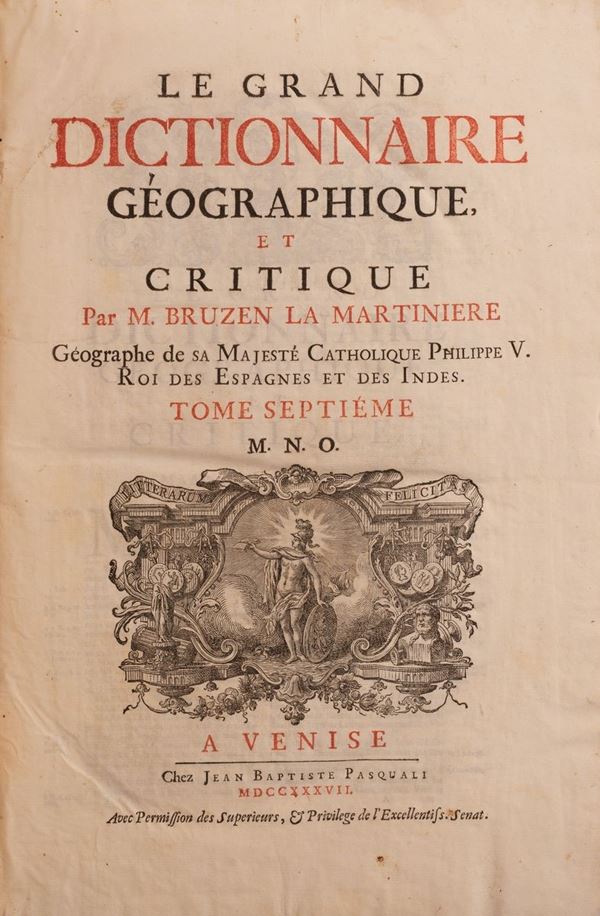 Dieci parti legati legati in 8 volumi in-folio (cm. 35,5), pp. oltre 6.000 complessive. Frontespizi in rosso e nero con grande vignetta centrale in xilografia. Solida legatura coeva in piena pergamena rigida, dorsi a piccoli nervi con titoli in oro su tasselli. Tagli rossi. Esemplare genuino e ben conservato. Da segnalare due difetti: Manca la copertura in pergamena dei piatti del primo volume e sono state asportate le prime 16 pagine dell'ottavo volume. Opera interessante e non comune che rappresenta il primo tentativo di ridurre la geografia mondiale ad una catalogazione enciclopedica. Ogni località conosciuta è minuziosamente descritta secondo le conoscenze del tempo. L'autore fu geografo reale e, nella sua vasta produzione letteraria, la presente opera viene segnalata come il suo maggiore contributo scientifico alla cultura settecentesca.