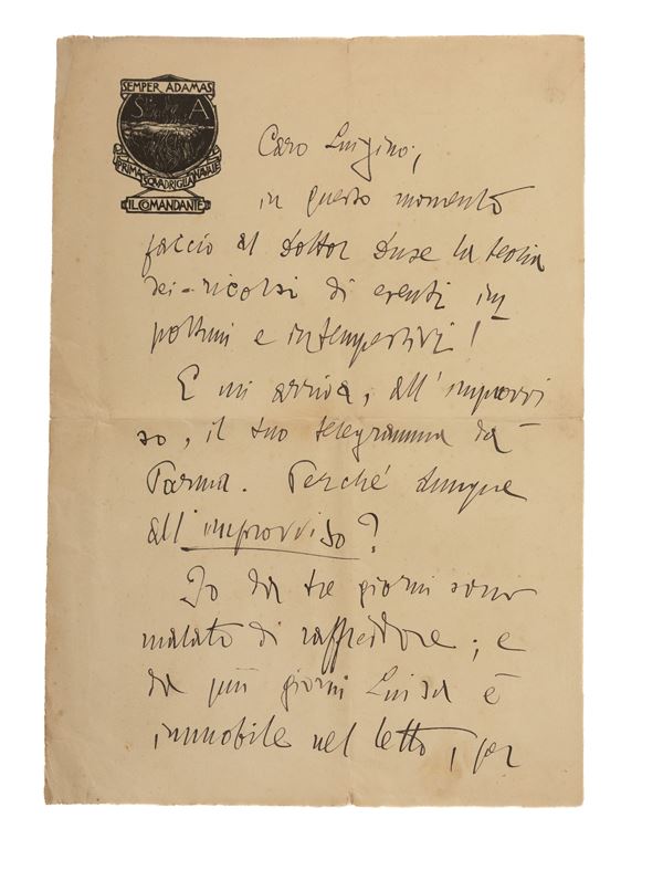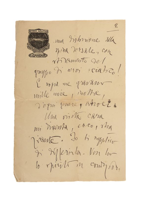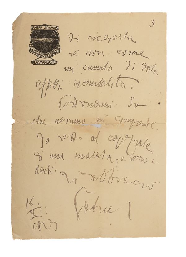 6) Lettera di tre fogli su carta intestata della Prima Squadriglia Navale comandata da d'Annunzio col motto in alto a destra "SEMPER ADAMAS, PRIMA SQUADRIGLIA NAVALE. IL COMANDANTE"
