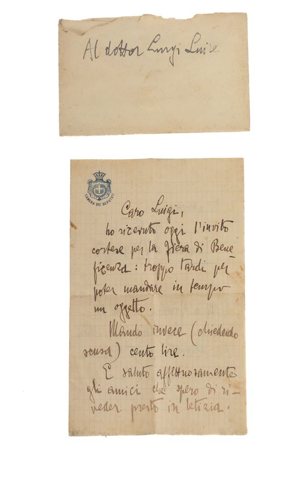 Condizioni: la busta da lettere presenta piccoli strappi ed una mancanza al retro nella parte alta sinistra. La lettera, piegata a metà, è in ottime condizioni.