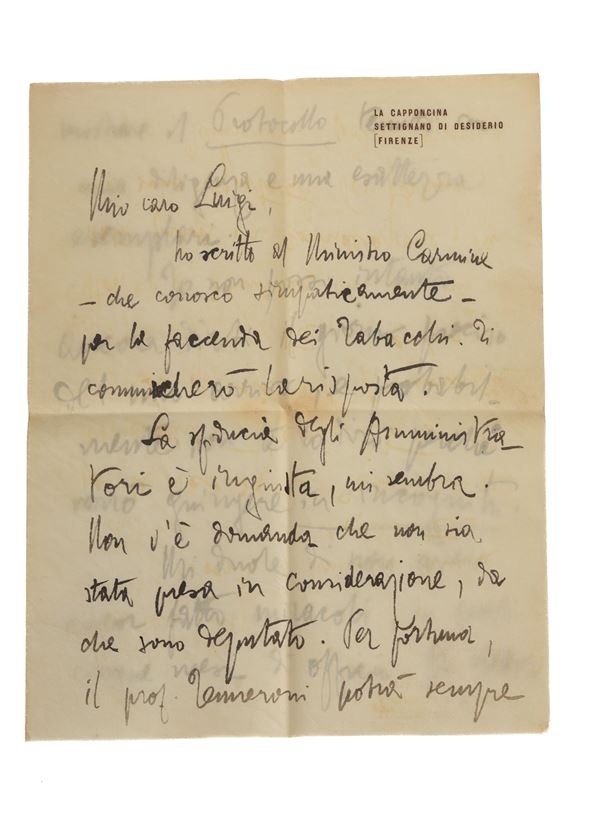 4) lettera di tre facciate su due fogli da quattro pagine, ciascuno con intestazione in inchiostro bruno e a caratteri capitali: "LA CAPPONCINA SETTIGNANO DI DESIDERIO (FIRENZE)