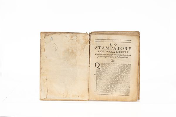 Volume formato 4°, rilegato in pergamena coeva, pp. 141, 430, esemplare in discrete condizioni, bruniture, gore, primo frontespizio mancante.
