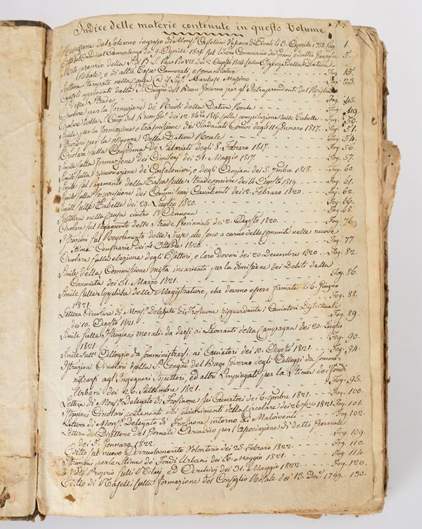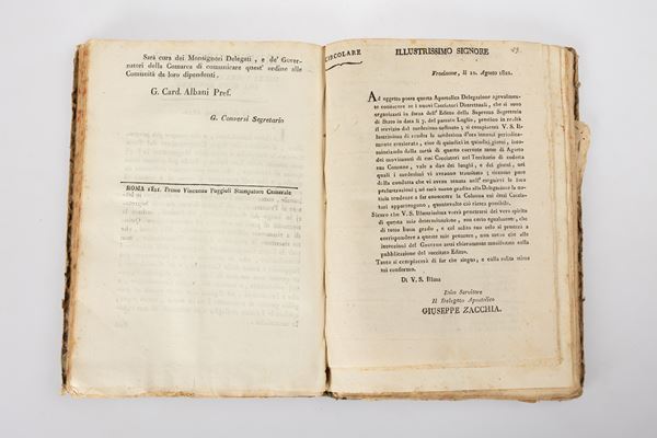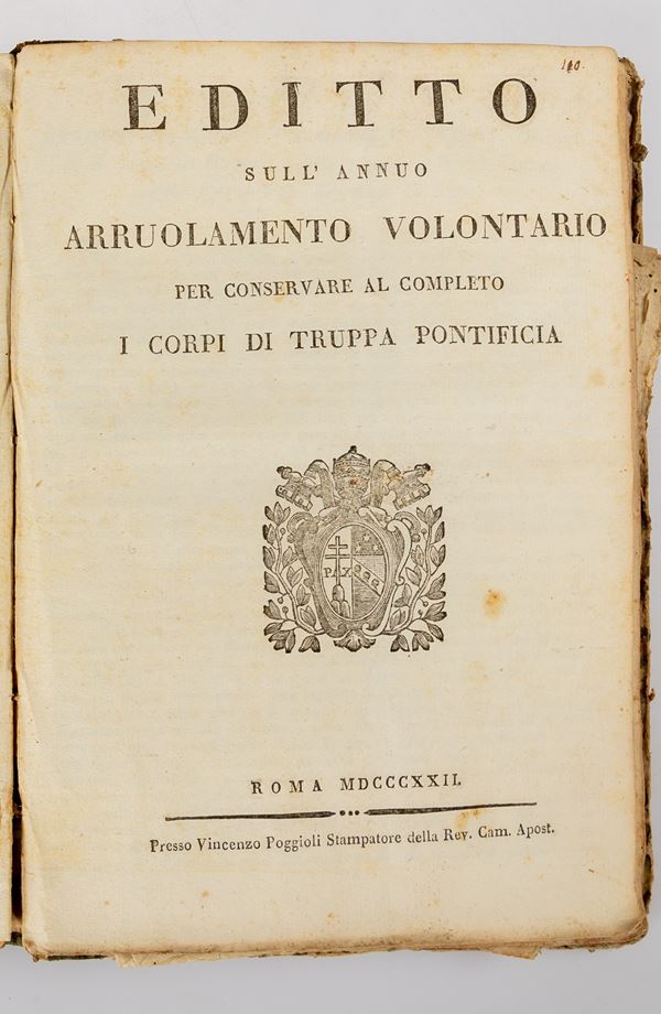 Descrizione: volume formato 4°, rilegato in mezza pelle, in discrete condizioni, comprende una raccolta di 34 editti dello Stato pontificio su varie materie, visibili nellʹindice manoscritto
