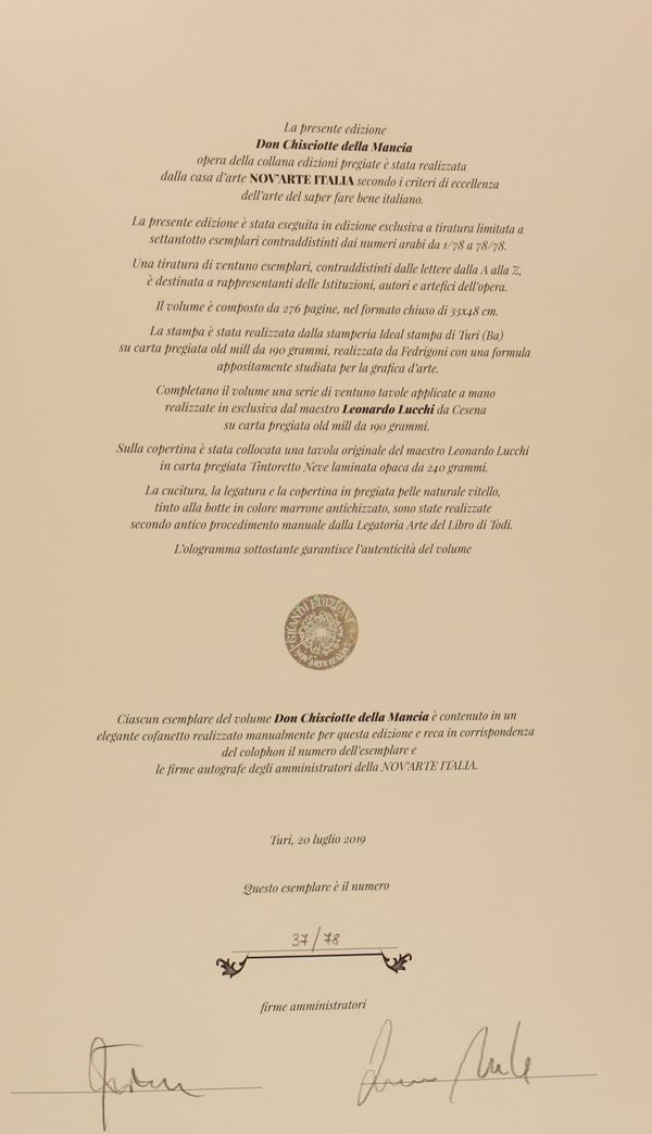 Volume in-folio grande, rilegato in piena pelle, titolo e fregi in oro al dorso, nervi a rilievo, piatto anteriore illustrato, pp. 269, esemplare n. 37/78 esemplari, in pregiata custodia editoriale telata, in ottime condizioni.