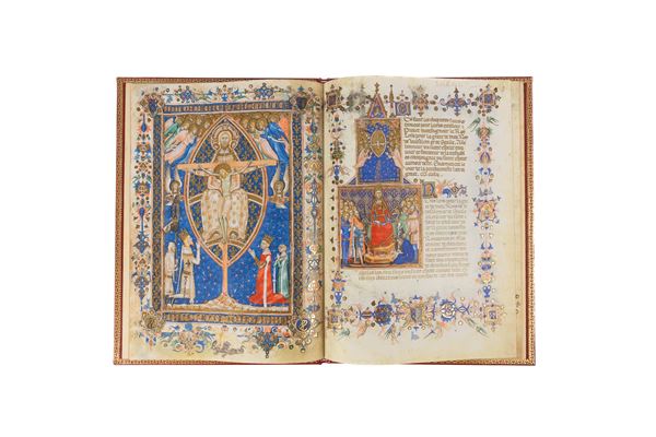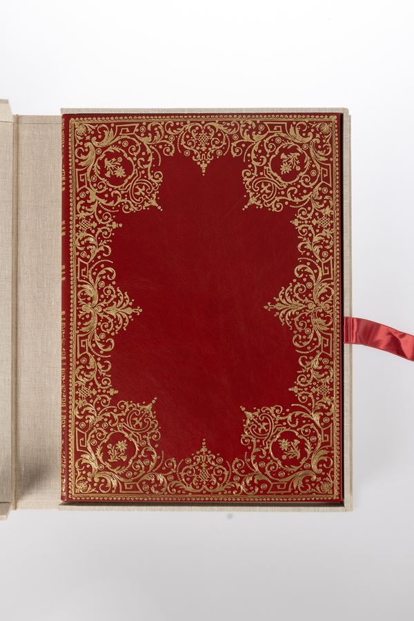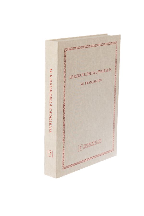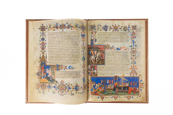 Miniature realizzate dal napoletano Cristoforo Orimina nella metà del XIV secolo. Legatura in marocchino rosso, con decorazioni a doppio filo dorato, dorso a sei nervature con fregi dorati. Commentario ( 16,5×24,5 cm. Pagine 136) in italiano a cura di Alessandro Barbero, Marco Cursi, Giovanni Palumbo, Alessandra Perriccioli Saggese.