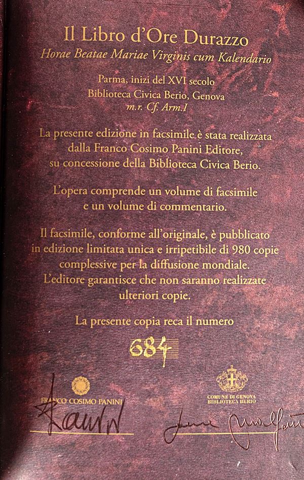 Il Libro d'Ore Durazzo, così chiamato dal nome del suo ultimo proprietario, è un piccolo capolavoro del pittore e miniatore Francesco Marmitta. Un'opera sorprendente che si distingue da ogni altro codice devozionale a uso privato per due peculiari caratteristiche: l'impiego della pergamena purpurea e la crisografia, cioè la scrittura a lettere d'oro, qui tracciata da un maestro dell'arte calligrafica, Pietro Antonio Sallando, docente presso l'Università di Bologna.