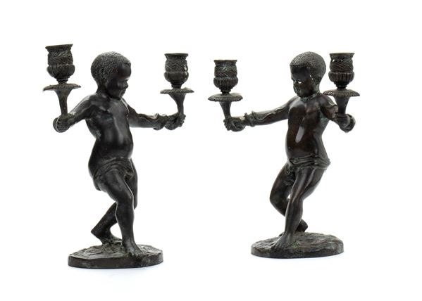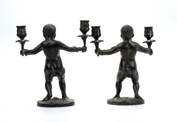 Coppia di piccoli candelabri con putti reggicandela in bronzo patinato nero