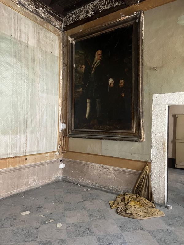 Condizioni: diffuse cadute di colore, taglio verticale nella parte centrale alta del dipinto che insiste per circa 15 cm.