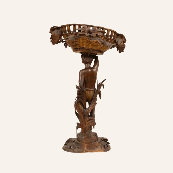 Centrotavola finemente intagliato con lumeggiature in oro sul tronco,sul cesto e tracce sul fogliame Rappresentante [..], cm 67x44x22
