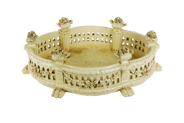 Nei toni dell'azzurro poggiante su quattro piedi a foggia di mascheroni urlanti, anse serpentiformi terminanti [..], Altezza 16 cm; Dimensioni 47.5x32.5 cm.