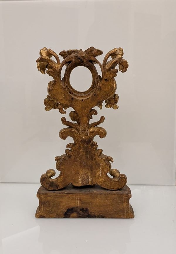 Reliquiario a ostensorio in legno di bosso dorato e riccamente intagliato con girali fogliati e fiori, poggiante su una base