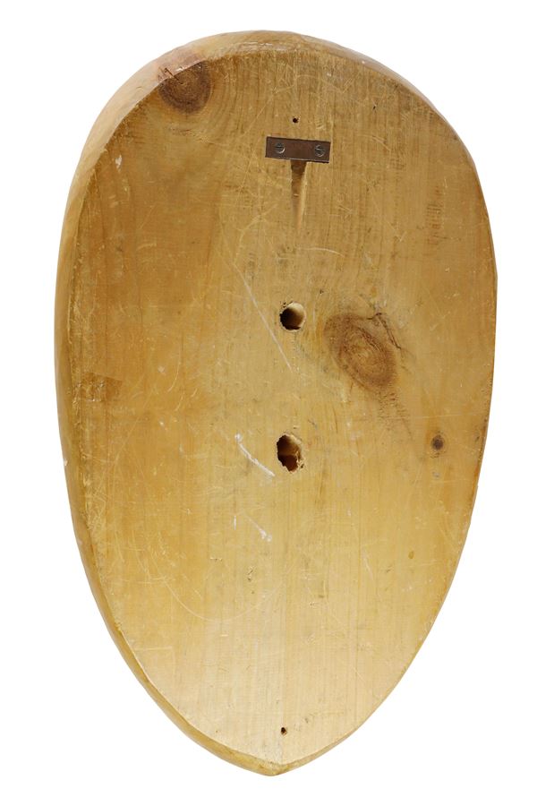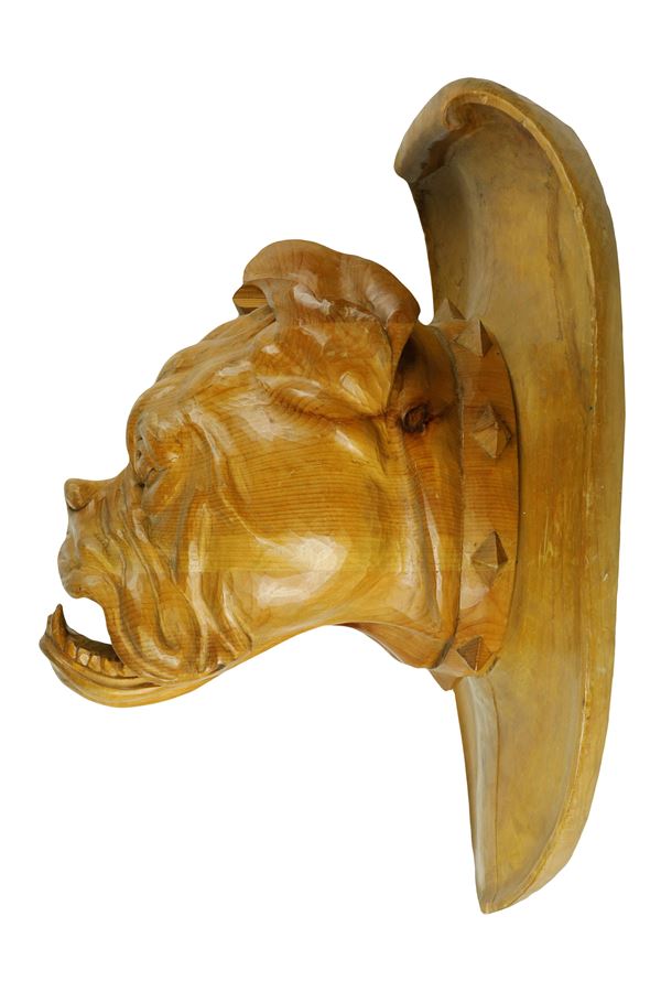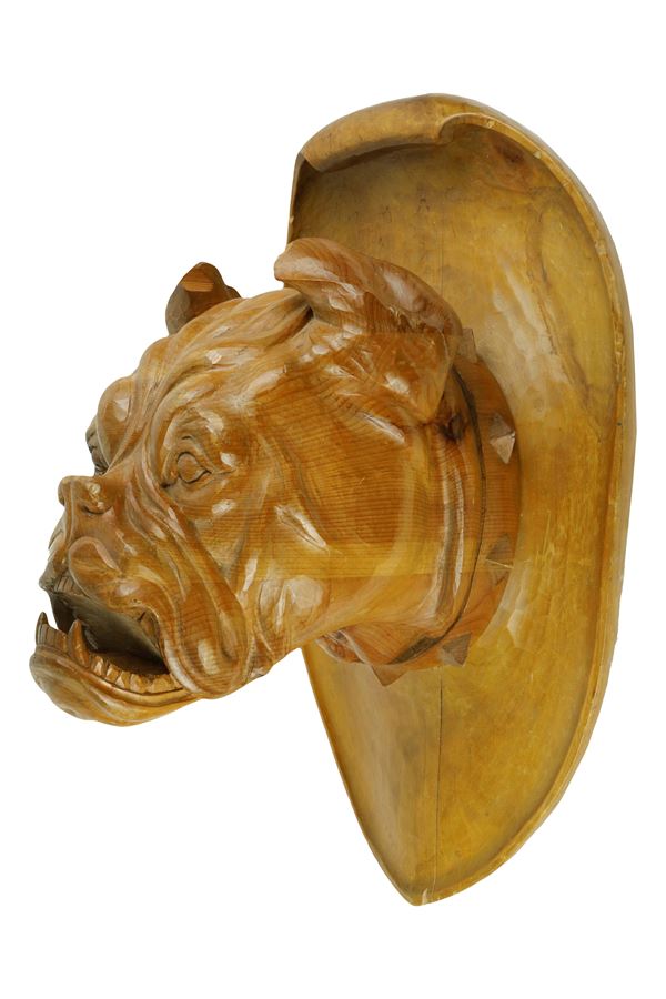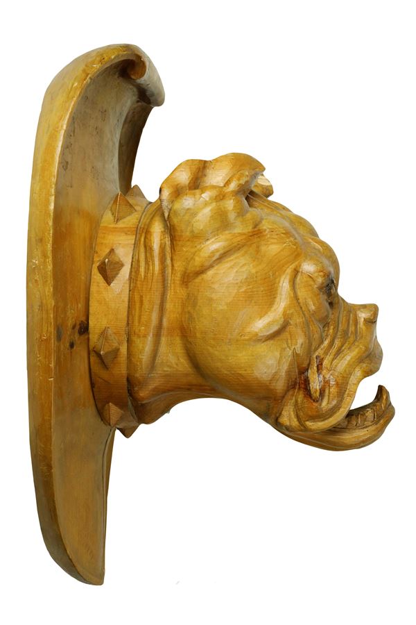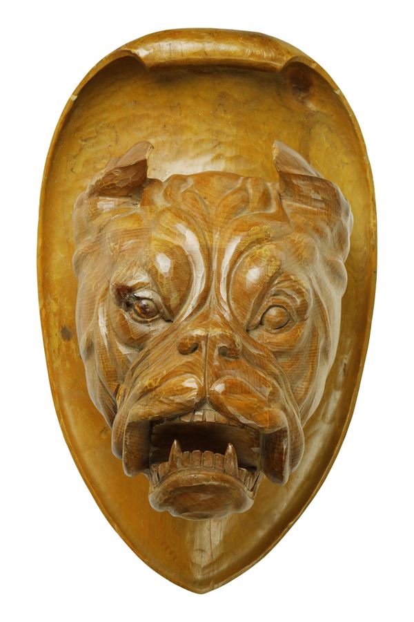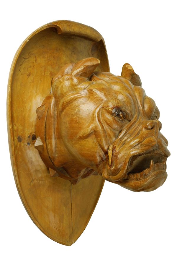 Trofeo con testa di bulldog in legno intagliato e scolpito poggiante su scudo ovale