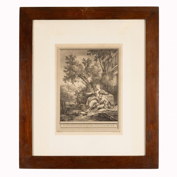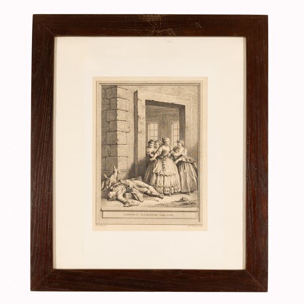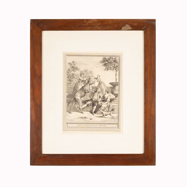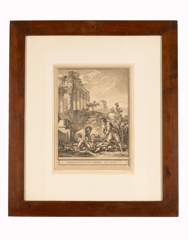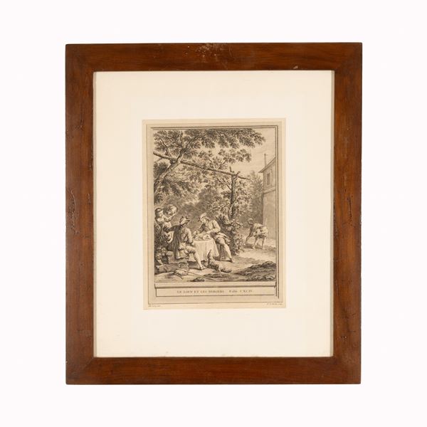 cm 45x37; con cornice cm 54x46Lotto di sei acqueforti tratte dal volume "Fables choisies, mises en vers par J. de La Fontaine" del 1756