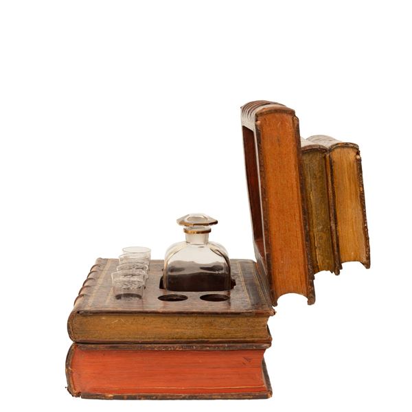 Scatola in pelle a foggia di due libri che nasconde set da liquore