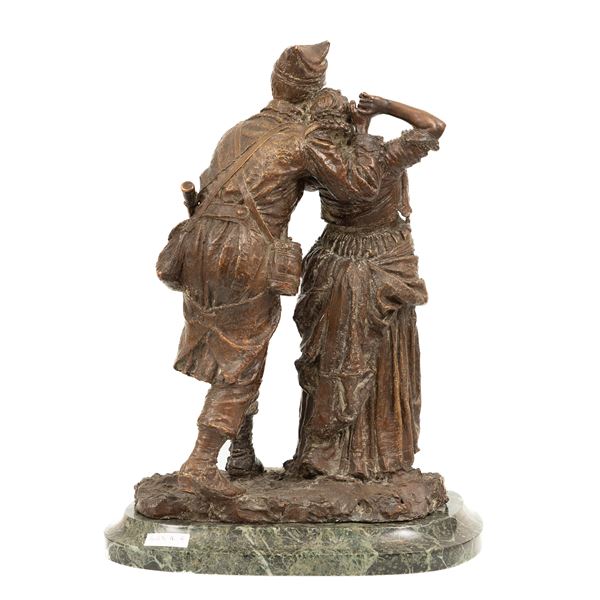Il gruppo scultoreo poggia su sottile basamento a sezione rettangolare. Su un terreno erboso sono rappresentati, stanti e frontalmente, una figura femminile che solleva un braccio in segno di sorpresa e con la mano solleva quella del soldato dietro le sue spalle che le copre le palpebre. La donna, scalza, indossa una camicia con le maniche rimboccate; un golfino girocollo con colletto ricamato; un alto corsetto; lunga gonna; intorno alla vita è legato un grembiule che, con ampie pieghe, scende fino a mezza gamba. Il soldato con baffi, in uniforme con stivali, porta due bisacce ed un cannocchiale a tracolla