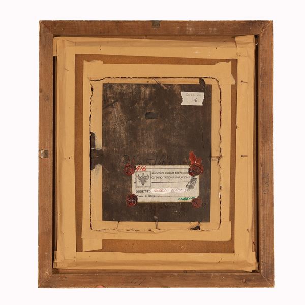 Sul retro un cartiglio – apposto con sigilli in ceralacca – esplicita l’appartenenza della tela: “Raccolta privata del Principe Ottavio Trigona d’Aragona”.