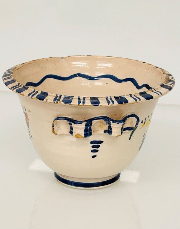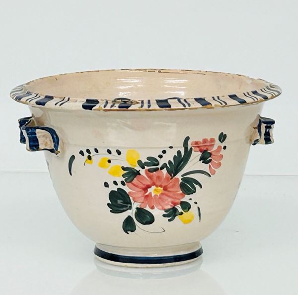 Grande ciotola in maiolica ad ornato floreale con prese e orlo decorate a nastro. Manifattura di Castelli, XX secolo