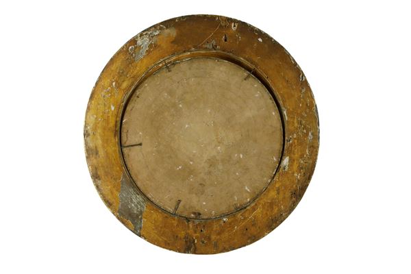 diametro cm 28; diametro con cornice cm 40Tondo in maiolica di Castelli con cornice coeva dorata ed ebanizzata.