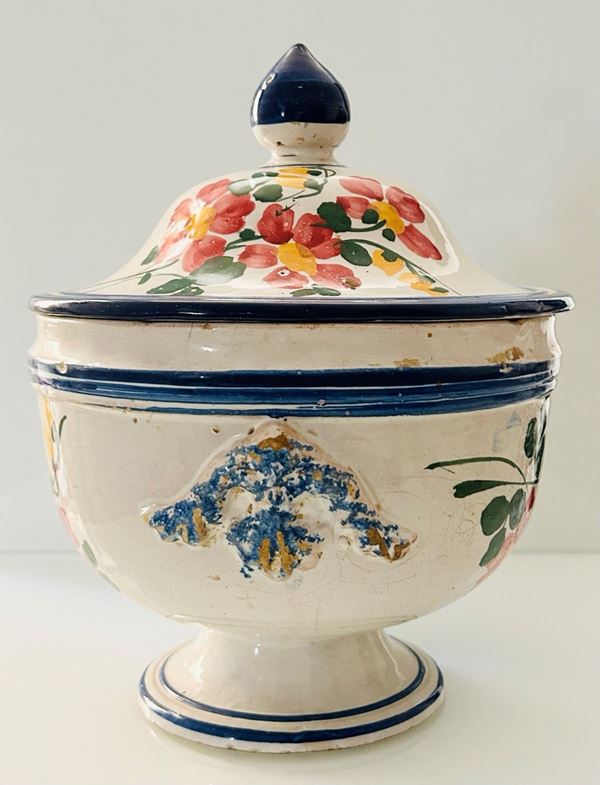 Zuppiera con decoro floreale e due prese floreali a rilievo.