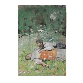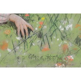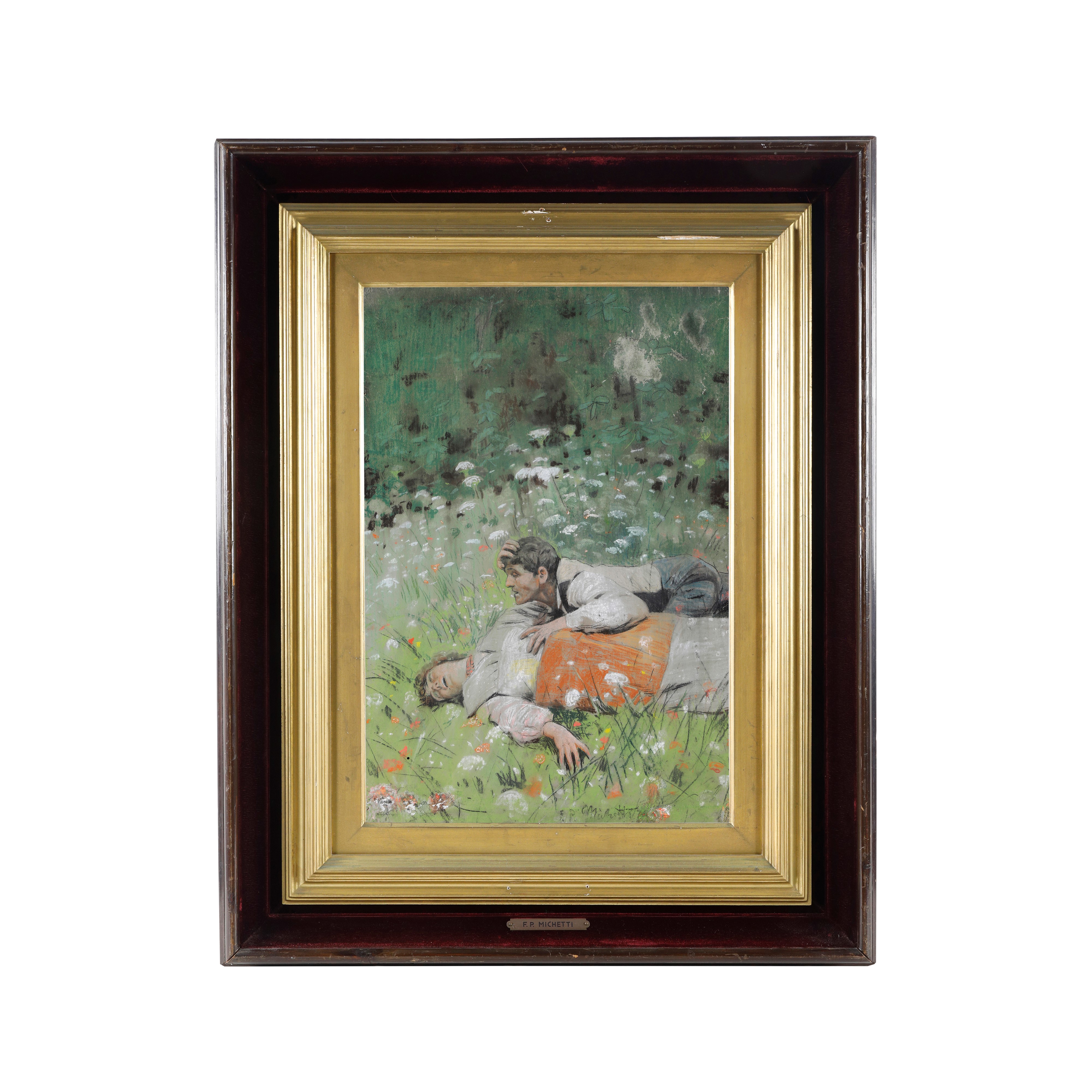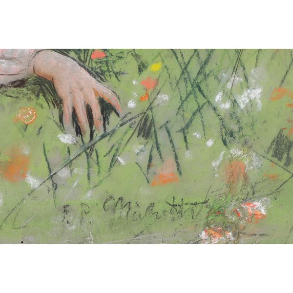 Cm 46,5x32 (cornice 72x57,5)Importante dipinto a pastello su carta, raffigurante "scena di innamorati in un campo di fiori". Firmato in basso a destra F. P. Michetti