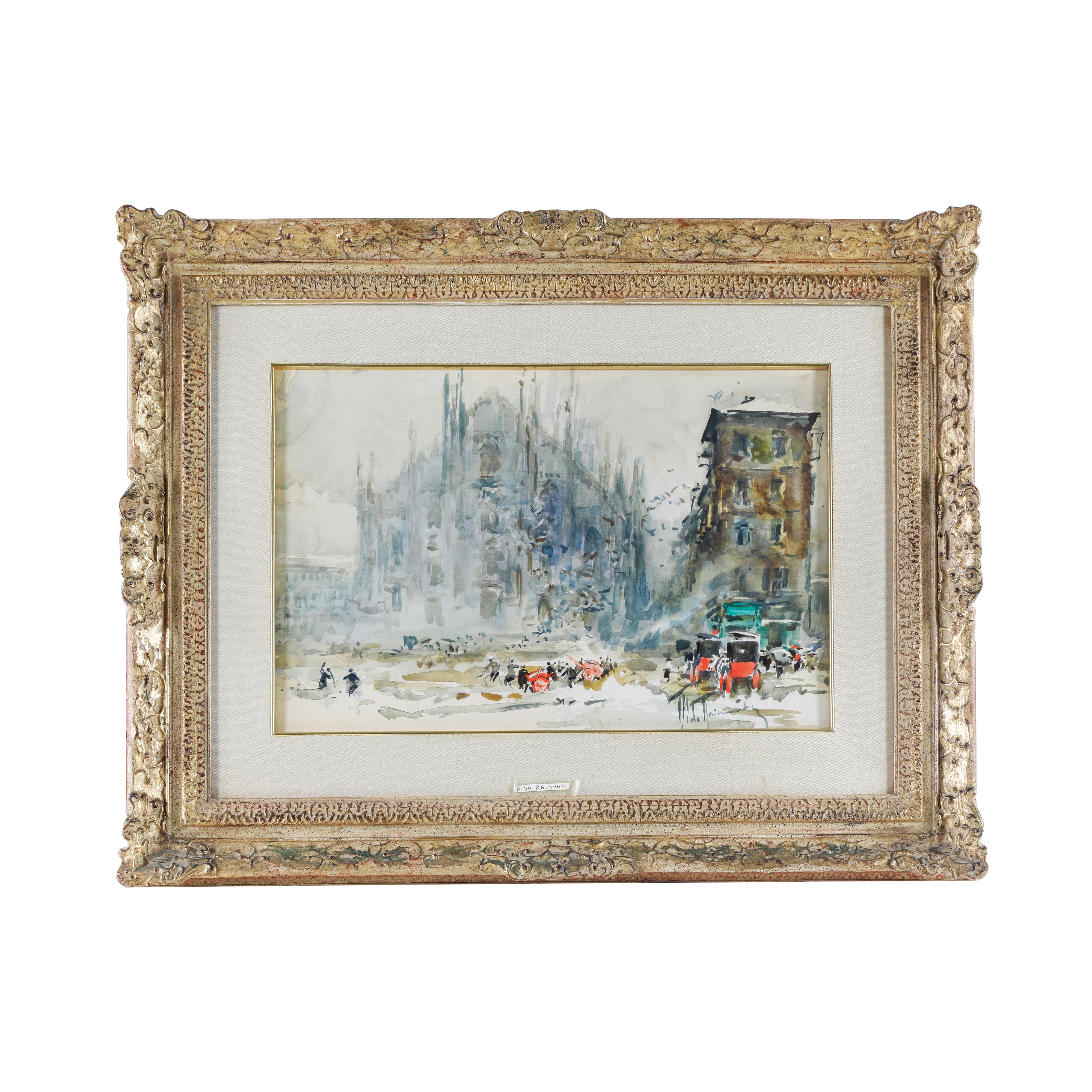 Cm 32.5 x 49,5 (cornice cm 56,8x74)Dipinto acquerello su cartone raffigurante "Duomo di Milano innevato"