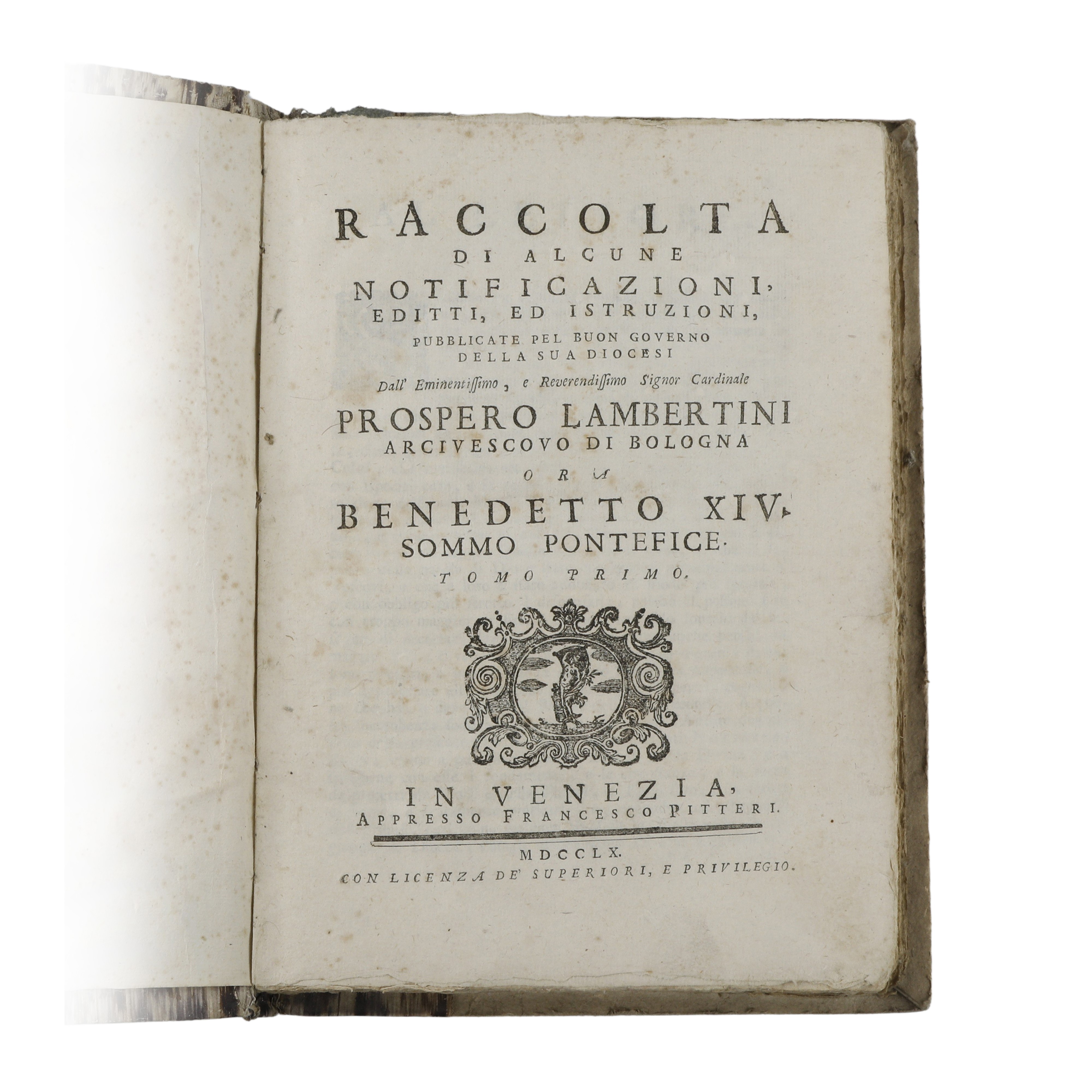 Lambertini, Prospero (Papa Benedetto XIV). Raccolta di alcune notificazioni, editti, ed istruzioni, pubblicate pel buon governo della sua diocesi dall'Eminentissimo, e Reverendissimo Signor Cardinale Prospero Lambertini Arcivescovo di Bologna or a Benedetto XIV Sommo Pontefice. Venezia, appresso Francesco Pitteri, 1760.