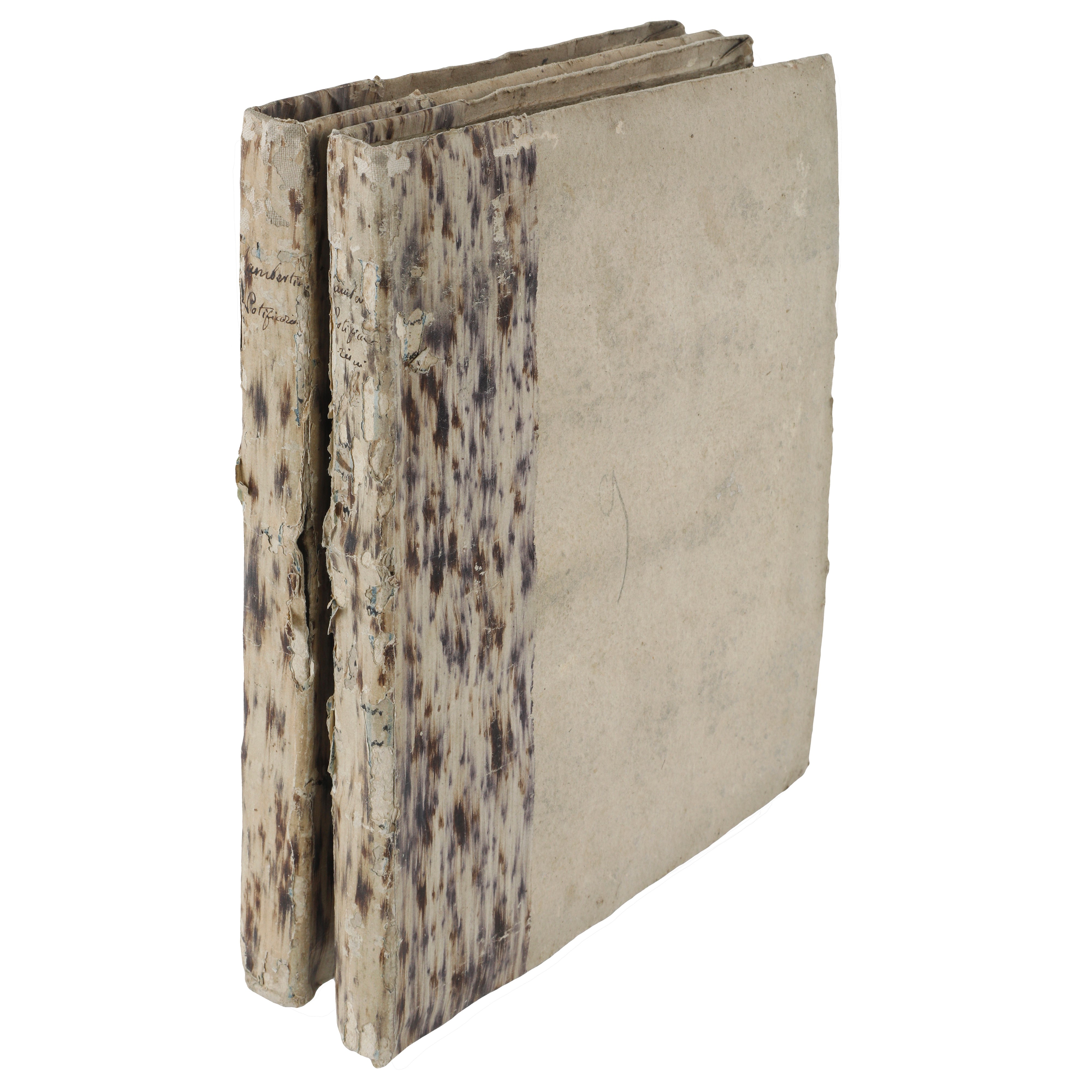 Brossura muta coeva in carta marmorizzata o decorata, con titoli manoscritti d'epoca ai dorsi ("Lambertini Notificazioni"). Lo stato delle legature è da considerarsi precario, con ampie lacune della carta di rivestimento e dorsi parzialmente scoperti.
