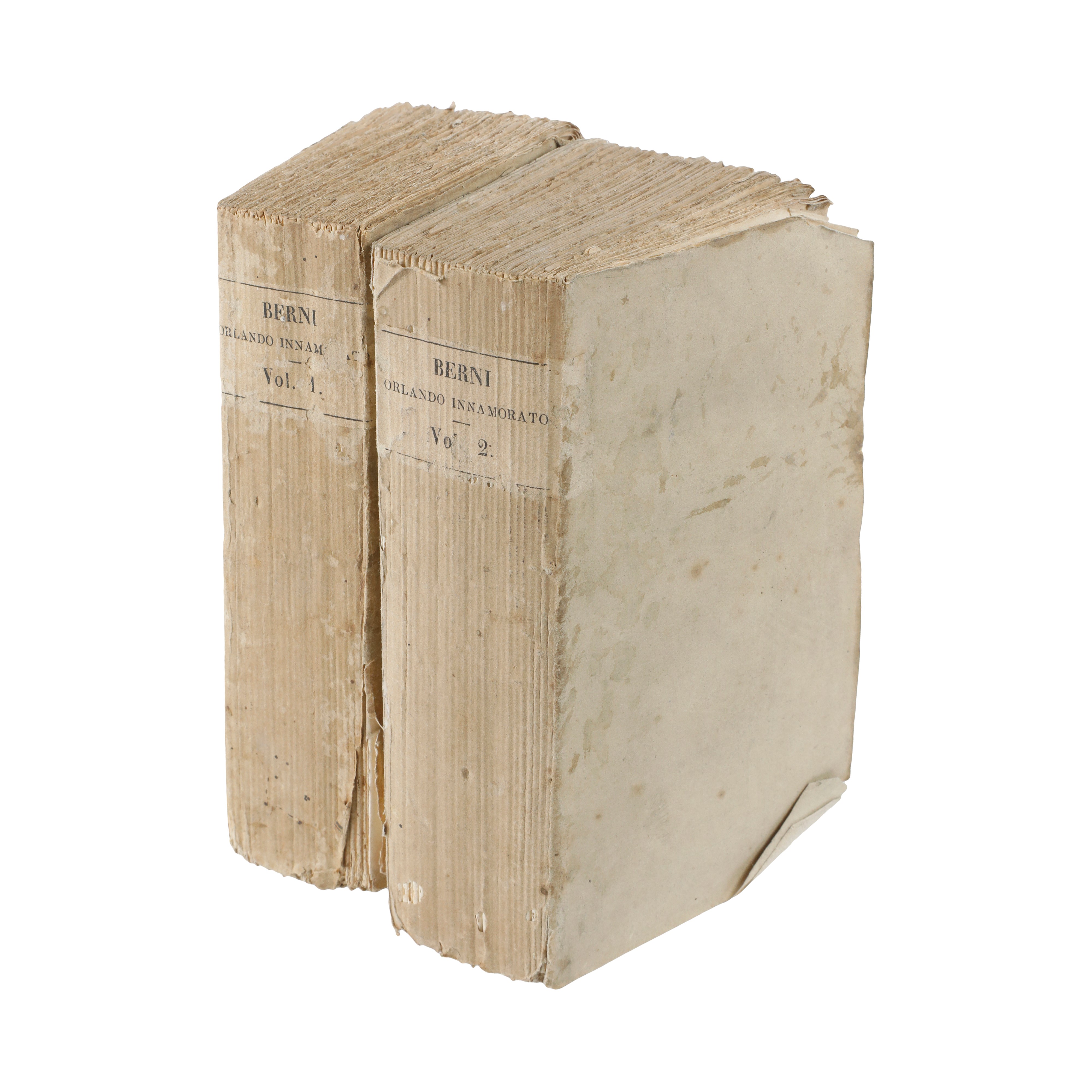 Brossura editoriale in carta arancione originale. I dorsi presentano i titoli stampati entro riquadri lineari ("Berni - Orlando Innamorato - Vol. 1 / 2"). La legatura appare vissuta, con evidenti segni di usura, mancanze di carta ai dorsi e piatti parzialmente distaccati o con abrasioni superficiali.