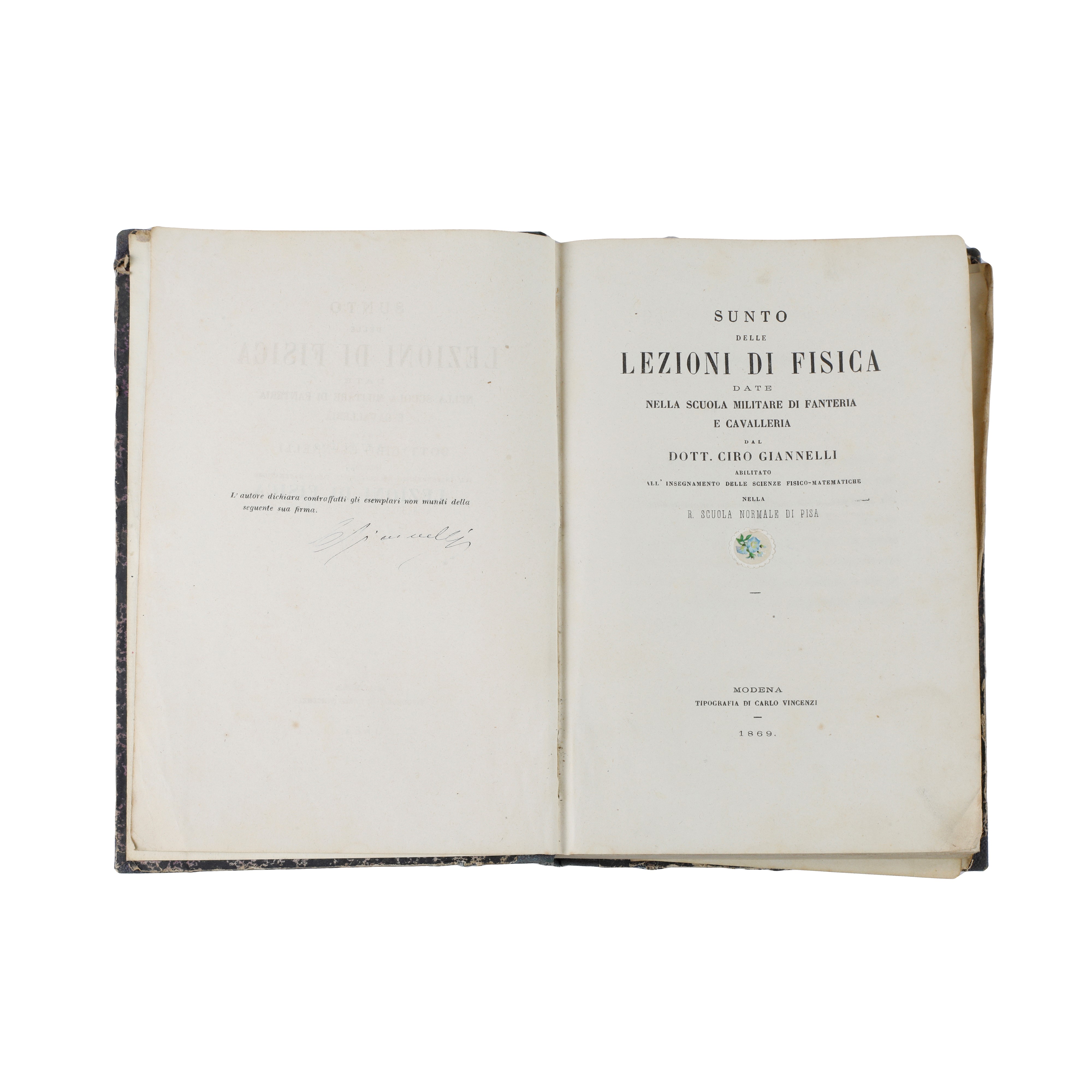 Raro manuale scientifico intitolato "Sunto delle Lezioni di Fisica", redatto dal Dott. Ciro Giannelli e pubblicato a Modena nel 1869 dalla Tipografia di Carlo Vincenzi.