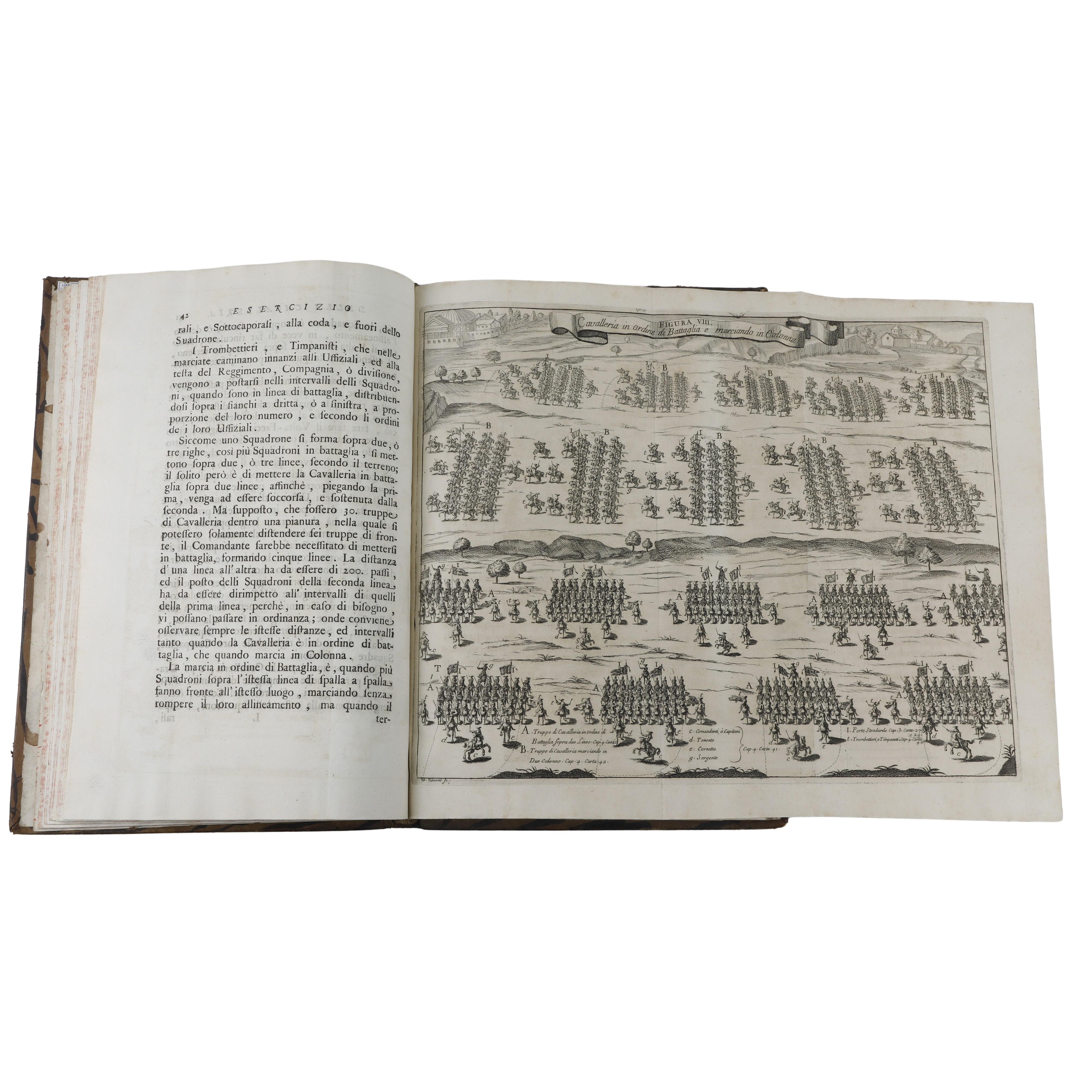 Capilettera e pregevoli xilografie di inizio e fine argomento, ricche incisioni a piene pagine, con tre incisioni, la prima tra pagina 38 e 39- la seconda tra pagina 42 e 43 – la terza tra pagina 50 e 51, con fogli ripiegati più ampi del volume. Opera completa in buono stato di conservazione. Il volume descrive le funzioni dei vari corpi militari di cavalleria (Guardie del Corpo, Moschettieri, Granatieri a cavallo, Dragoni, Carabinieri…) e dei metodi di addestramento. Il libro, presente negli archivi, è raro e questa copia è completa.