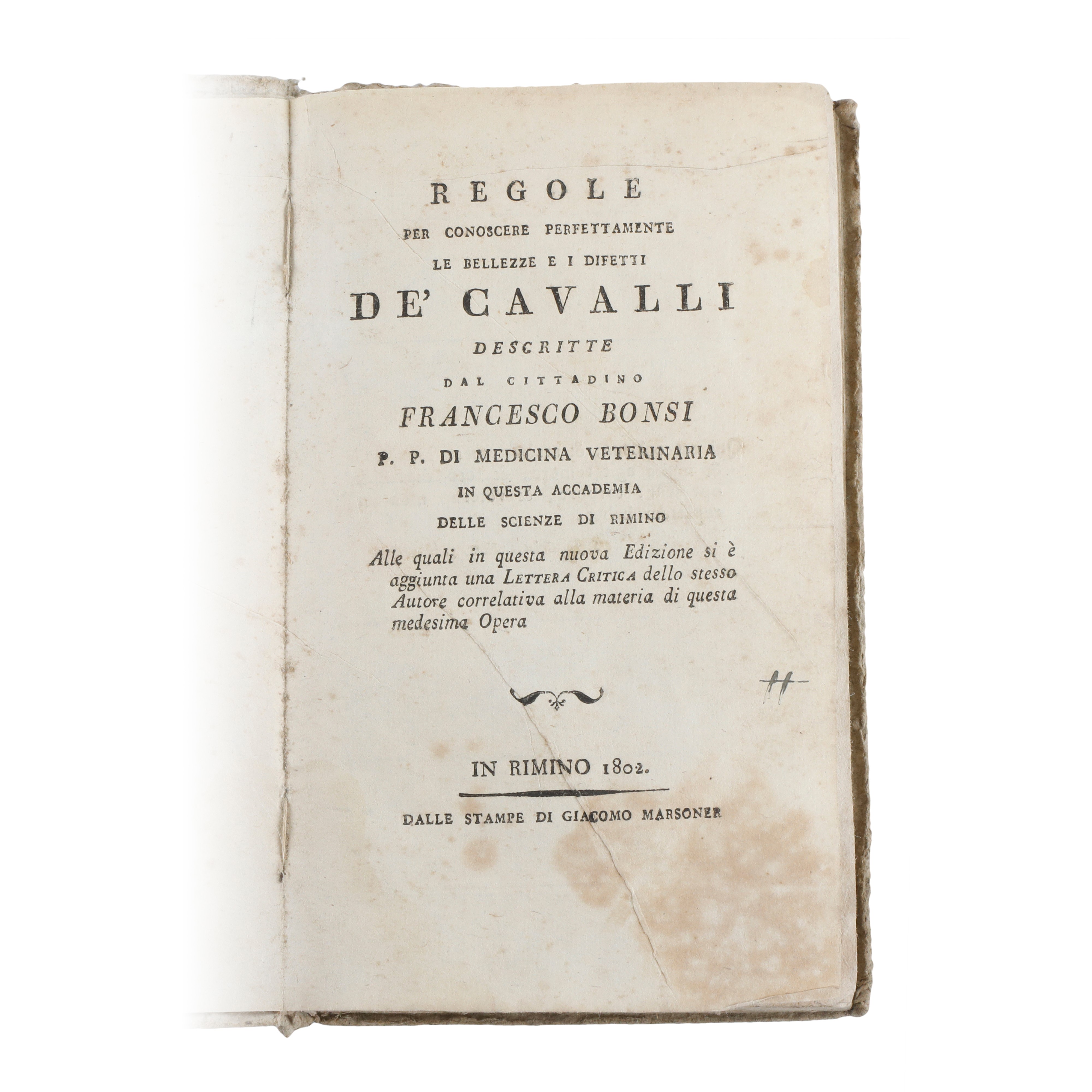 Volume in ¼ Folio con copertina in cartone, con macchie di umidità, non completo. Il libro è stato scritto dal Professor Bonsi autore di alcuni volumi in materiae, la presente edizione contiene anche una lettera critica aggiunta dallo stesso autore in calce. L’opera nello specifico tratta di ippologia e medicina veterinaria e nello specifico delle regole per valutare i pregi e i difetti dei cavalli. Esiste una precedente edizione del 1751.