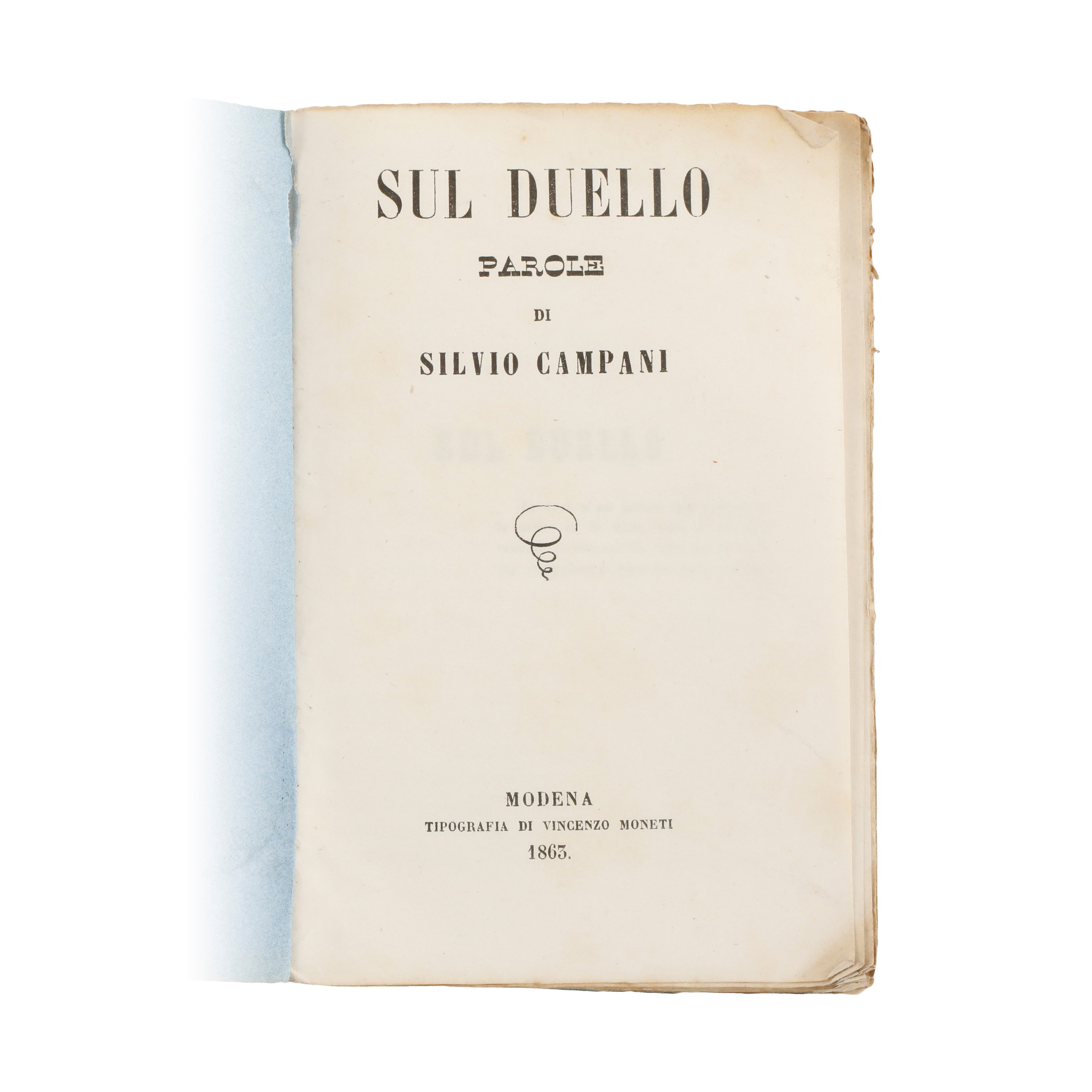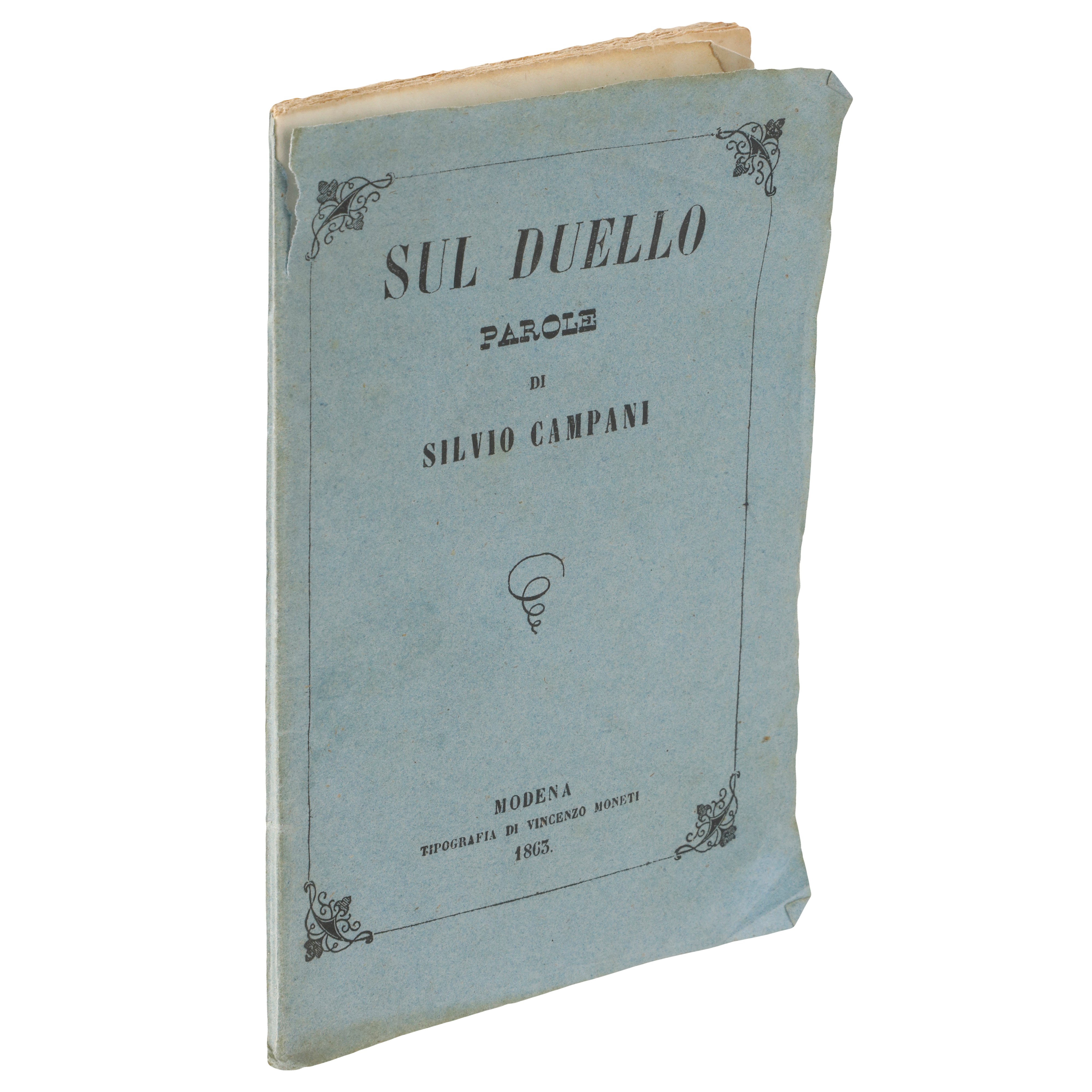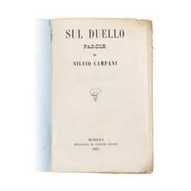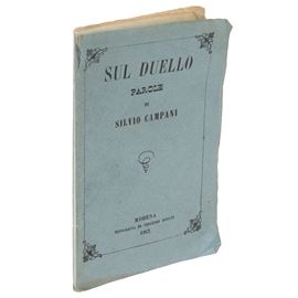 Libretto in 1/16 Folio, trattatello di poche pagine, 69 oltre quella di indice, in carta comune, nel quale si danno le origini dl duello e le ragioni e i motivi perché questo sia praticato. In definitiva, è un volumetto che descrive la pratica attraverso i motivi ad esso avversi della morale, religione, onore e ragione, oltre che cenni di diritto penale.