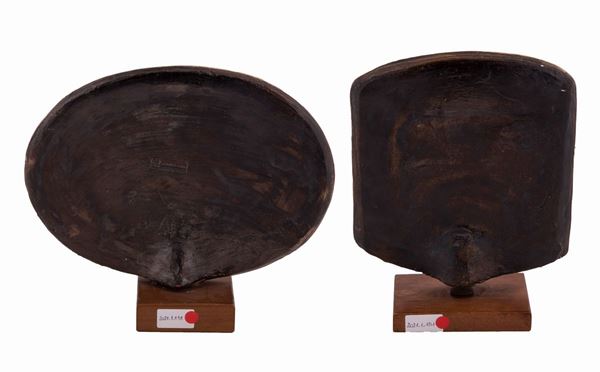 Due piatti in ceramica a) figura con lumaca e farfalla; b) figura con vaso di fiori