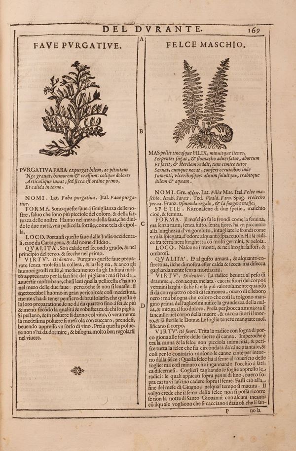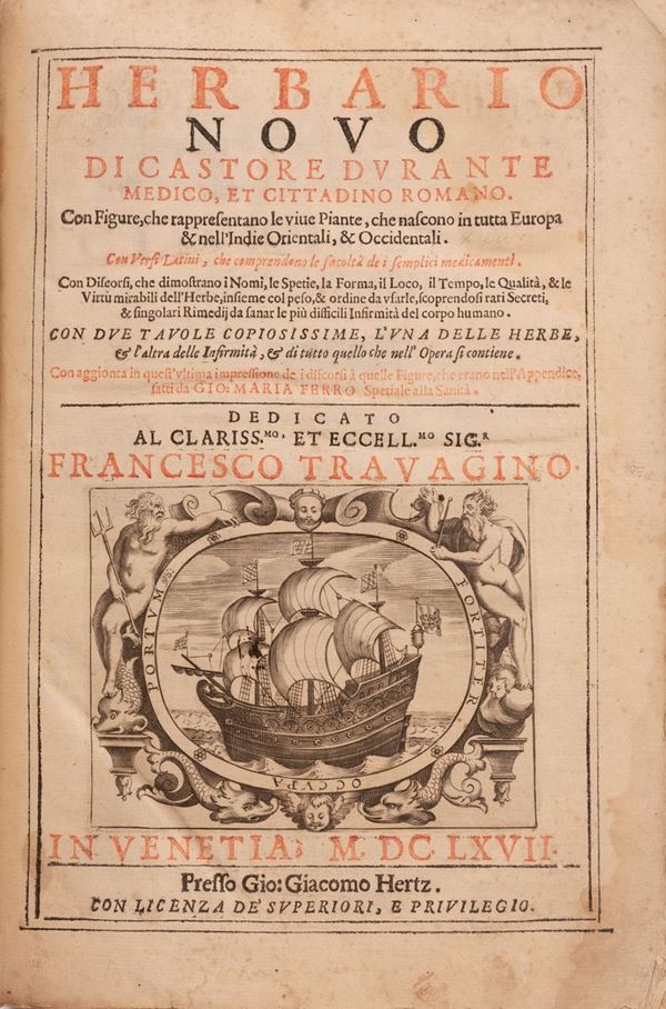 TITOLO: Herbario nouo di Castore Durante medico, et cittadino romano. Con figure, che rappresentano le viue piante, che nascono in tutta Europa & nell'Indie orientali, & occidentali. Con versi latini, che comprendono le facoltà de i semplici medicamenti. Con discorsi, che dimostrano i nomi, le spetie, la forma, il loco, il tempo, le qualità, & le virtù mirabili dell'herbe, ... Con due tauole copiosissime, l'vna delle herbe, & l'altra delle infirmità, ... Con aggionta in quest'vltima impressione de i discorsi a quelle figure, che erano nell'Appendice, fatti da Gio. Maria Ferro spetiale della Sanità. ...