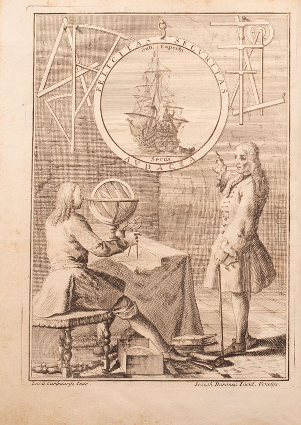 DESCRIZIONE: [4], xix, [1] 78, [2], 470, [2] p., IX c. di tav. : ill. ; 4º. mezza pergamena moderna e angoli, pp. XX, 470. (Alla fine: Vocabolario Francese - Italiano e Italiano - Francese, dé termini di marina, coll'aggiunta del Termine vernacolo Veneziano ove è diverso dal comune in Italia). Antiporta, (Luca Carlevaris inv. & Ioseph Baronus incid.), frontespizio stampato in rosso e nero con vignetta allegorica di Venezia, un finale, una bella testata e 9 belle tavole incise in rame, di bandiere, vascelli ecc. Tavole dalla V alla IX staccate dal libro ma presenti.