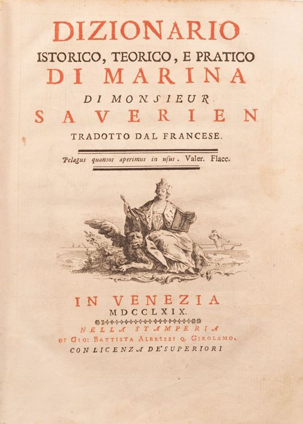 TITOLO: Dizionario istorico, teorico, e pratico di marina di monsieur Saverien tradotto dal francese