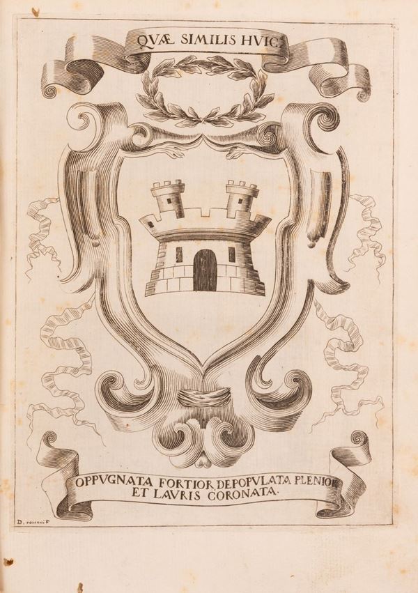 Rilegato in bella pergamena contemporanea. Compreso di frontespizio, 4 tavole incise in rame. Stemma della città. [18] fogli,  279, (1) pagg.
