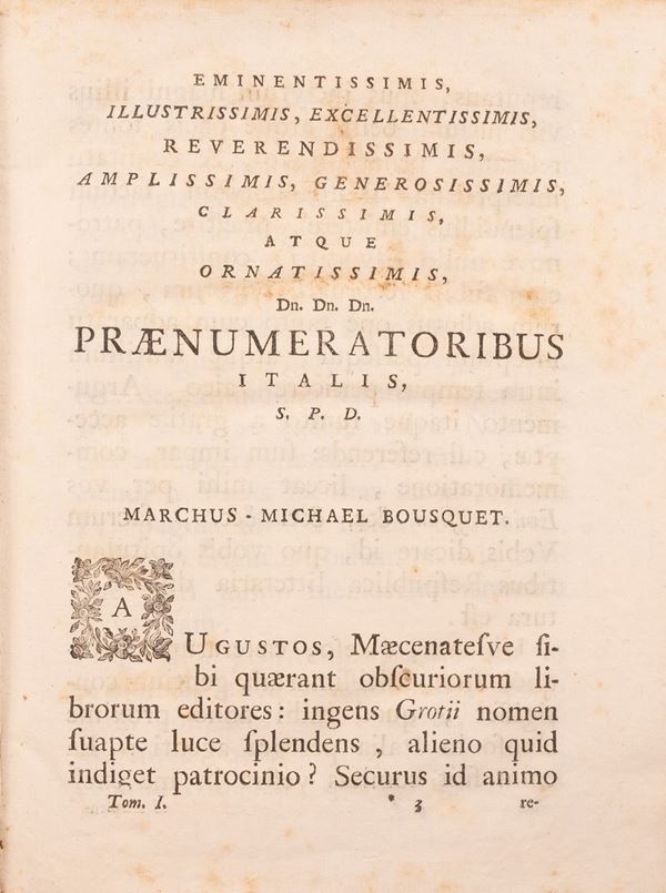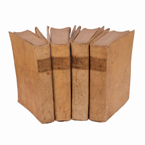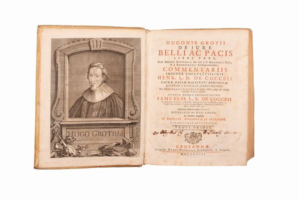 5 voll. in 8 (cm 20 x 26), pp. LXIII + 396 con antiporta incisa raffigurante Grozio; 731 + (1); 689 + (1) con antiporta incisa con ritratto di De Cocceio; 638; XX + 703. Alcune pagine si presentano brunite, fioriture sparse in qualche pagina ma sporadiche. Legatura coeva in piena pergamena con tasselli al dorso, qualche lieve spellatura ai tagli dei piatti. Edizione settecentesca di Losanna (edizione originale 1625) dell'opera principale di Grotius arricchita per la prima volta dalle Osservazioni di Samuel von Cocceji.