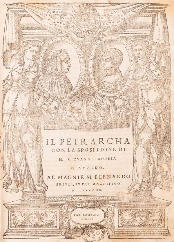 DESCRIZIONE: 4° (cm 15,5 x 22) – 2 parti – carte (22) – 346; (72) – con 2 frontespizi figurati e 6 grandi xilografie ai Trionfi. Solida legatura settecentesca in piena pergamena rigida – titolo manoscritto al dorso e al taglio inferiore – cucitura leggermente allentata in alcuni punti. Antico timbretto di appartenenza al frontespizio – margini sobri (soprattutto quello superiore) – leggero alone giallastro nell’angolo superiore esterno dall’inizio fino a carta 70 e da carta 307 alla 12 dei Trionfi – leggere fioriture sparse - qualche macchiolina qua e là – alcuni fascicoli leggermente allentati – nel complesso. Buon esemplare ben legato. Bella edizione in 4° illustrata del Petrarca.