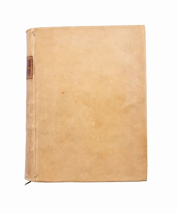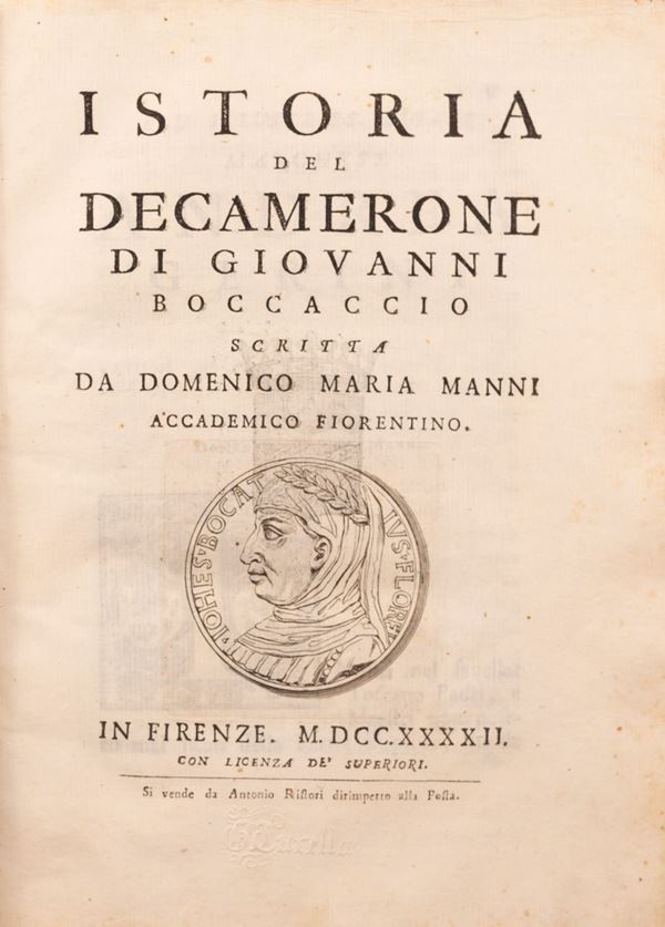 DESCRIZIONE: XXX, 672 [i.e. 678], [2] p., [2] carte di tav. di cui 1 ripiegata : ill. ; 4º, legatura in piena pergamena coeva con titoli in oro al dorso, volume completo e ben conservato tranne una macchia di umido che interessa le ultime 60 pagine e le prime tre e che ha intaccato la legatura posteriormente, piccoli restauri alle prime pagine ed al frontespizio. Ritratto del Boccaccio su medaglione al front., 2 tavv. f.t. di cui la prima in legno e la seconda ripieg. in rame (queste ultime ritraggono rispettivamente la casa del Boccaccio e lo splendido epitaffio del poeta, che tradizione vuole essere stato pronunciato dal poeta stesso sul letto di morte). Alcune xilogr. raffiguranti sigilli n.t. Ricercata biografia del Boccaccio, la più bella e documentata mai andata alle stampe, che ampliò e corresse i lavori analoghi compilati in precedenza da Girolamo Squarcifico, Giannozzo Manetti e Filippo Villani. I primi XXXV capi di questa meritoria fatica del Manni ci danno informazioni distinte toccanti nascita, patria, studi, viaggi, impieghi e morte del poeta. Rilevante a questo riguardo anche le informazioni intorno ai legati e alle esecuzioni testamentarie, dalle quali apprendiamo aver il Boccaccio lasciato tutti i suoi libri al padre Martino da Signa, maestro di teologia nel Convento di Santo Spirito in Firenze. La seconda parte dell'opera è dedicata a spiegare separatamente ciascuna delle cento novelle che compongono il Decamerone, la terza e ultima parte è impiegata a illustrare e raffrontare le diverse redazioni manoscritte dell'opera.