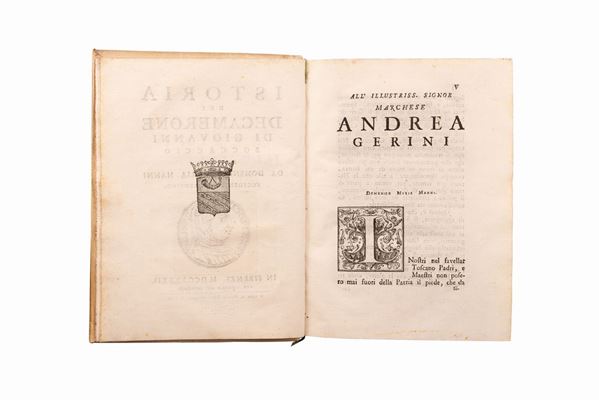 · Sul frontespizio ritratto calcografico di Boccaccio; sul verso del frontespizio stemma xilografico del dedicatario, Andrea Gerini
