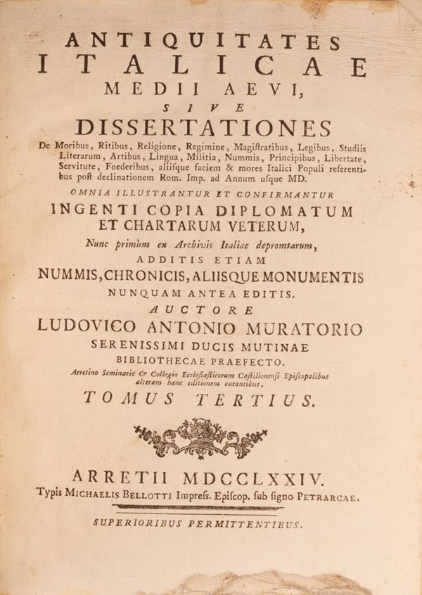 LUDOVICO ANTONIO MURATORIANTIQUITATES ITALICAE MEDII AEVI, SIVE DISSERTATIONES DE MORIBUS, RITIBUS, RELIGIONE, REGIMINE, MAGISTRATIBUS, LEGIBUS, STUDIIS LITERARUM, ARTIBUS, LINGUA, MILITIA, NUMMIS, PRINCIPIBUS, LIBERTATE, SERVITUTE, FOEDERIBUS, ALIISQUE FACIEM & MORES ITALICI POPULI REFERENTIBUS POST DECLINATIONE ROM. IMP. AD ANNUM USQUE MD. OMNIA ILLUSTRANTUR, ET CONFIRMANTUR INGENTI COPIA DIPLOMATUM ET CHARTARUM VETERUM, NUNC PRIMUM EX ARCHIVIS ITALIAE DEPROMTARUM, ADDITIS ETIAM NUMMIS, CHRONICIS, ALIISQUE MONUMENTIS NUMQUAM ANTEA EDITIS