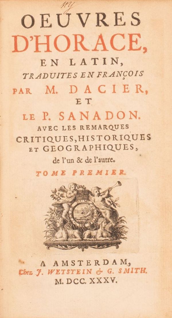 Oeuvres d'Horace, en latin, traduites en françois par M. Dacier et le P. Sanadon avec les remarques critiques, historiques et geographiques [..]