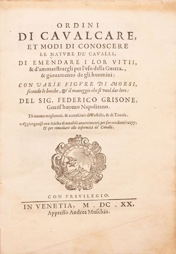 TITOLO: Ordini di caualcare, et modi di conoscere le nature de' caualli, di emendare i lor vitii, & d'ammaestrargli per l'vso della guerra, & giouamento de gli huomini: con varie figure di morsi, secondo le bocche, & il maneggio che si vuol dar loro: del sig. Federico Grisone, gentil'huomo napolitano