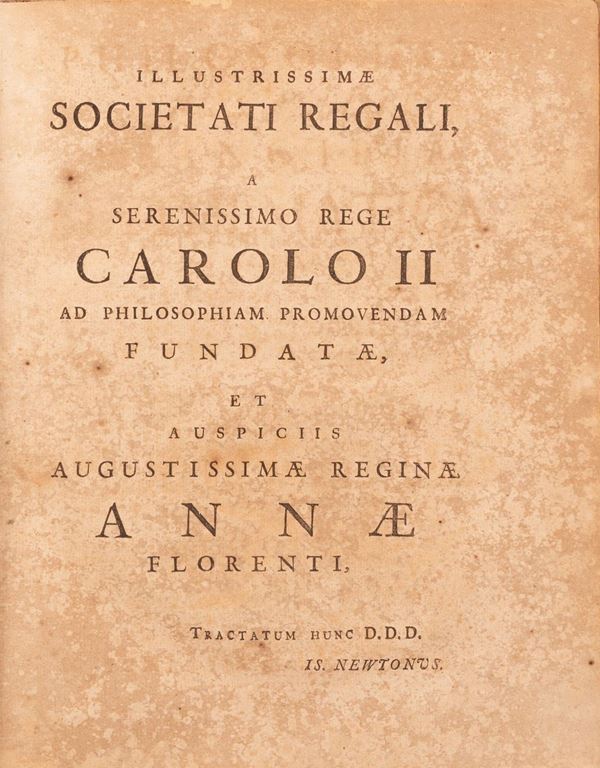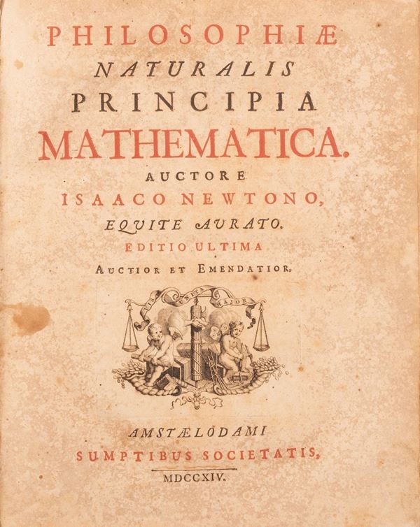 In 4° (mm 260x205). Pagg. (28), 484, (8). Frontespizio in rosso e nero con vignetta allegorica in rame, con putti e motto "Vis Unita Major". Firma di possesso non identificabile; una tavola ripiegata in rame f.t. raffigurante l'orbita della cometa, che secondo le tesi di Newton poteva essere non solo ellittica, ma anche iperbolica e parabolica. Centinaia di diagrammi silografici nel testo. Alle prime carte dedica a Carlo II, segue un poemetto di E.D. Halley a Newton e due prefazioni di Newton, datate "Londini, May 8 1686" e "Mar. 28 1713"; poi la prefazione editoriale curata da Roger Cotes professore di astronomia e filosofia sperimentale del Trinity College, datata "Cantabrigiae Maii 12. 1713" e infine lo "Index Capitum totius operis". Pergamena rigida coeva con unghie, titolo su tassello in oro al dorso, tagli blu. Seconda edizione, prima tiratura di Amsterdam (una seconda olandese fu pubblicata nel 1723) editata mentre Newton lavorava ancora ai suoi studi, redatta sulla seconda del 1713, la prima a contenere lo "Scholium generale" scritto in risposta alle obiezioni di Berkeley e Leibniz, ma rivista e corretta interamente ad Amsterdam; appaiono per la prima volta aggiunte e correzioni dell'A. ed anche le incisioni vengono eseguite e aggiunte apposta per questa edizione.